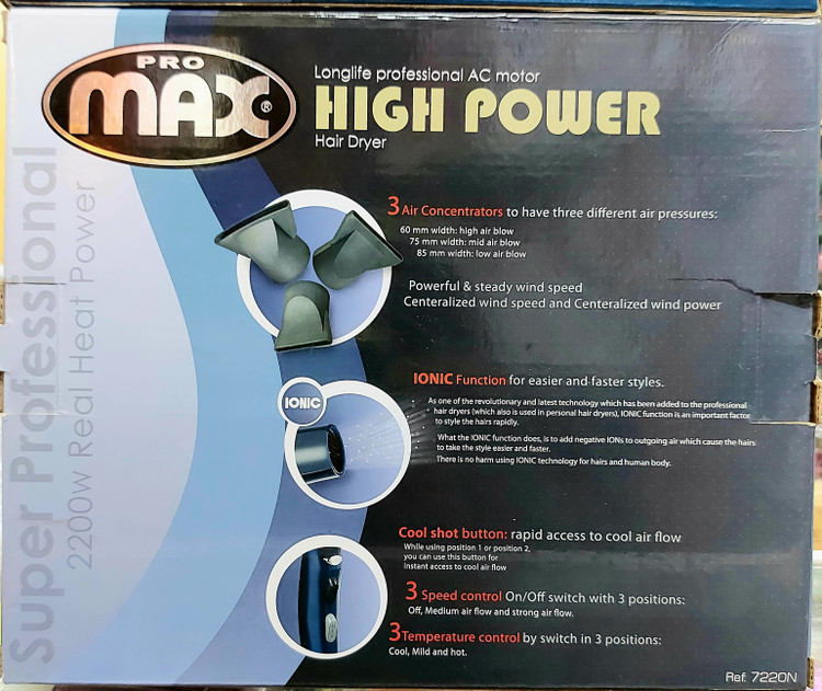 سشوارهایی که در آرایشگاهها استفاده میشوند با سشوارهای خانگی یک فرق بزرگ دارند و آن موتور سشوار است. موتور سشوارهای حرفهای از نوع AC است که در مقایسه با موتور DC قدرت بیشتر و عمر طولانیتری دارند. سشوار «پرومکس» (Promax) مدل «7220N» سشواری حرفهای دارای موتور پرقدرت 2200 وات AC، فناوری تولید یون، دکمهی باد سرد و سه متمرکز کنندهی هوا است.